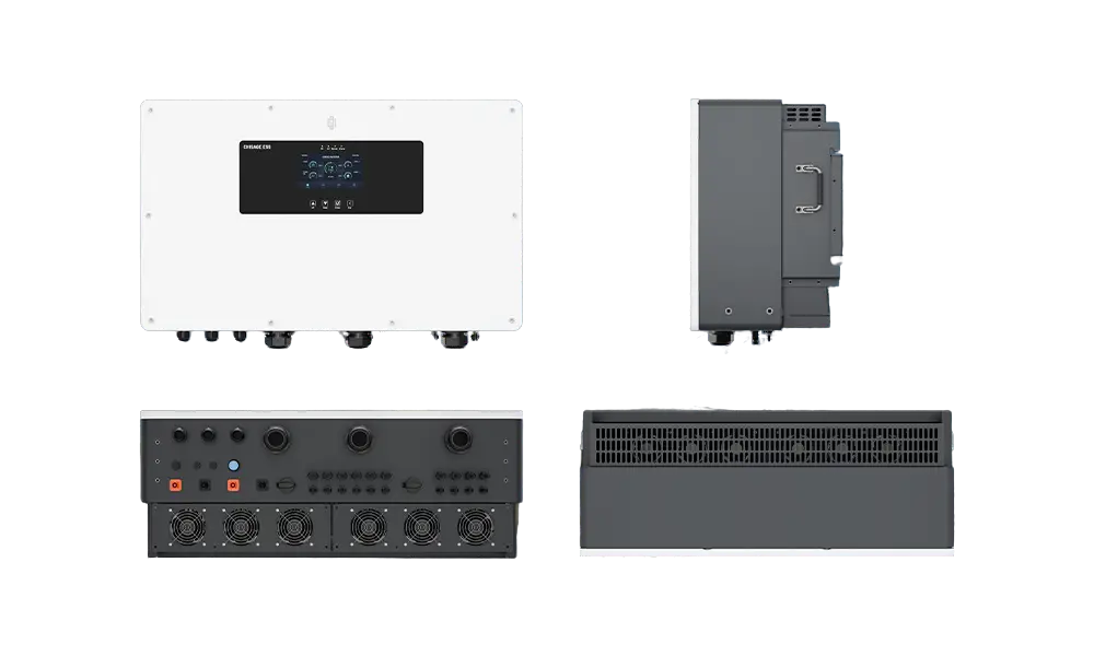 The CHISAGE ESS Merc Series is a three-phase hybrid inverter with 20 kW to 60 kW rated output, featuring 97.60% maximum efficiency, and parallel scalability up to 20 units for off-grid operation.